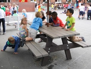 Spielplatzmobiliar soll langlebig, stark und auf Kindermaß sein.